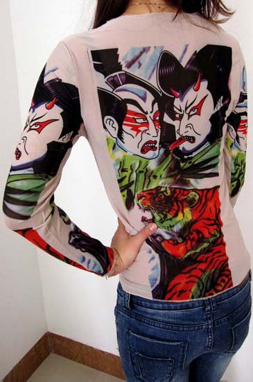 Bravery and ferocity is an enduring theme of tattoo art. This is a Japanese style tattoo T-shirt design that uses the Japanese Ninja (in Kabuki make up) plus a tiger to symbolize power, ferocity and bravery.