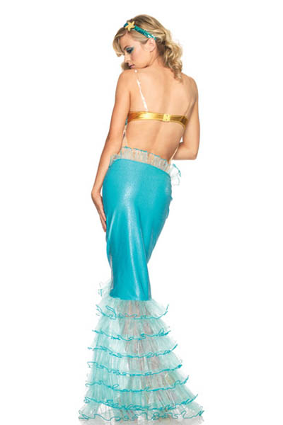 The three-piece, Mystical Mermaid costume includes a mini dress with an organza tail, clear straps and matching headband.