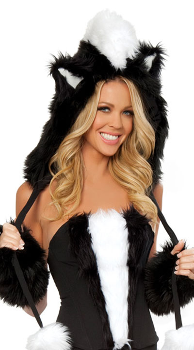 The Sexy Flower Skunk costume features luxurious black and white fur, a lace-up corset style tube top with boning, side zipper and a wide, elastic waist, furry skirt with long fur tail. Hood, gloves and legwarmers all coming. Juniors sizing, runs small. The fabric for this costume is an ultra plush, soft faux fur.