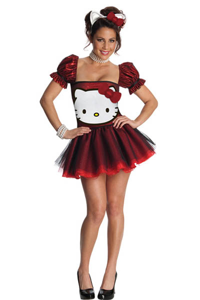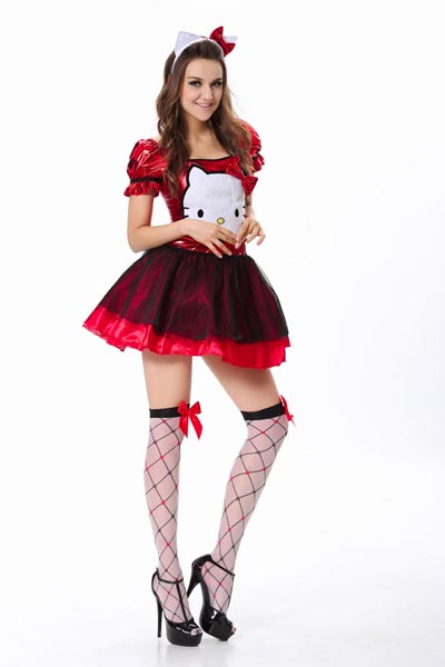 The two-piece red sequin Hello Kitty costume set features a shimmery red dress with Hello Kitty face in front, red bow, tulle overskirt, puff sleeves and matching headband. (Jewelry not included.)