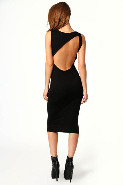Style Notes .Open back bodycon midi dress .Keep it classy with this bodycon midi dress .Midi dresses are a huge trend and super flattering shape, and we’re loving this scoop neck dress with open back .This dress features an open back to the reverse .Add some simple high court shoes and structured bag and you’ll definitely wow