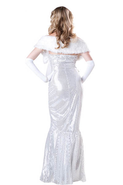 Evoke the spirit of a sensational star of years gone by or create your own big screen siren in this Seductive Starlet Adult Costume. This classically styled costume includes a full-length shimmering white and silver sequin polyester dress, a faux fur stole and long white gloves. Jewelry and an award prop not included.