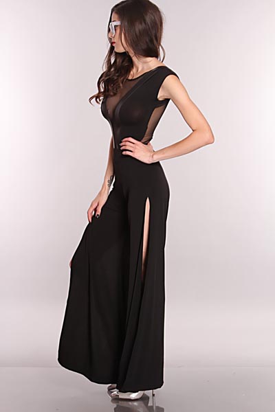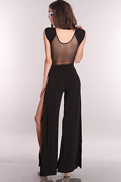 Black Mesh Cut Out Side Slits Jumper Outfit L5502-2 |