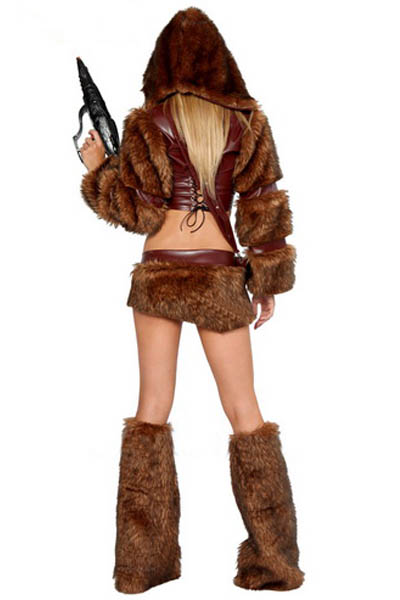 Explore the galaxy while staying warm with the Sci-Fi Furry Costume set that includes a brown vinyl crop top with back lace up detail and faux fur panels, brown lace-up mini skirt with vinyl waistband and faux fur bottom, brown faux fur hood with attached faux fur sleeves and vinyl bands, faux fur leg warmers .