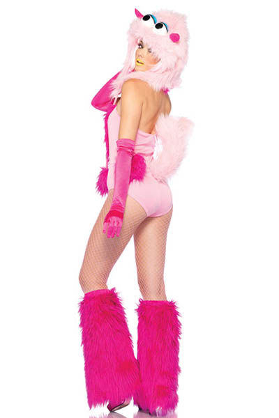 Furry Cotton Candy Monster The Furry Cotton Candy Monster costume features a pink romper with hot pink fur front detail with matching neck detail, attached light pink furry tail and a light pink furry monster hood with hot pink pom pom ties,also come legwarmers. (Wig, stockings sold separately.)