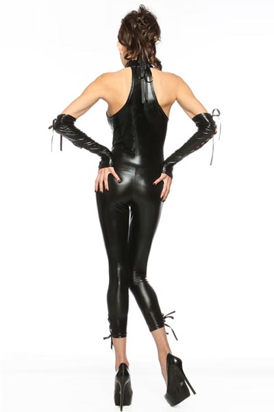 Prowl through the night with this Black Panther costume that features a sleek black catsuit with ankle ties, lace up elbow length gloves and a matching ear headband.