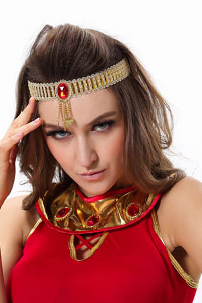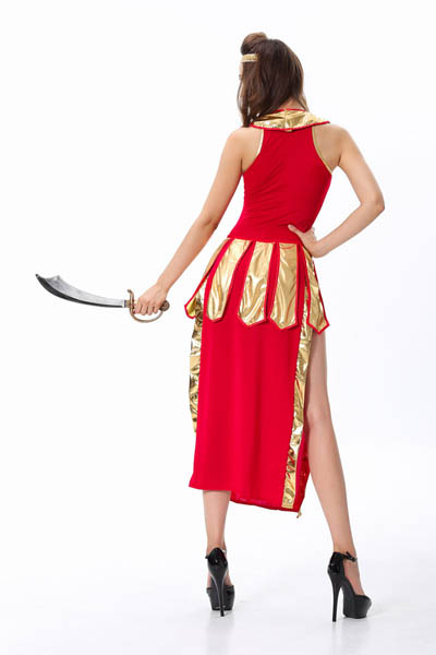 Warrior Princess Costume includes, red and gold convertible dress has with jeweled neckline. The strategically placed zipper across skirt hemline allows the dress to go from ankle length to short and sexy. Once unzipped, the bottom of the dress can be worn as a cape. Headpiece included. Please Note- Sword not included.