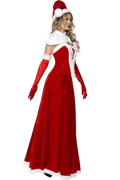 Includes a red velour look lace up corset top with faux fur trim, a long red velour skirt with netting underlayer to add volume, a pair of elbow length red velour style gloves with matching trim and a small white fur cape to go over the shoulders. Completing the costume is a deluxe red Santa's hat finished with fur trim and an oversized pom pom.