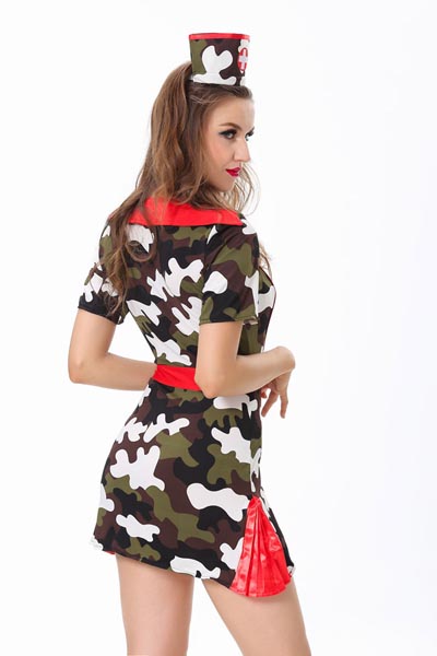 The Nurse costume includes a camouflage print mini dress with red piping detail, pleated skirt, zipper front, nurse hat .