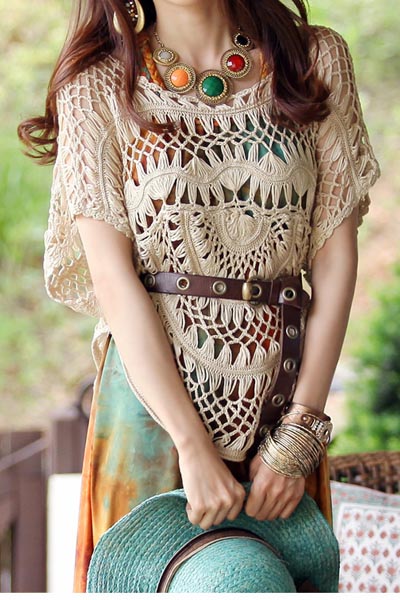Round Neck Red Bodice Crochet Knit Beachwear L38296