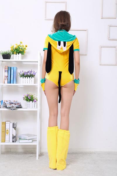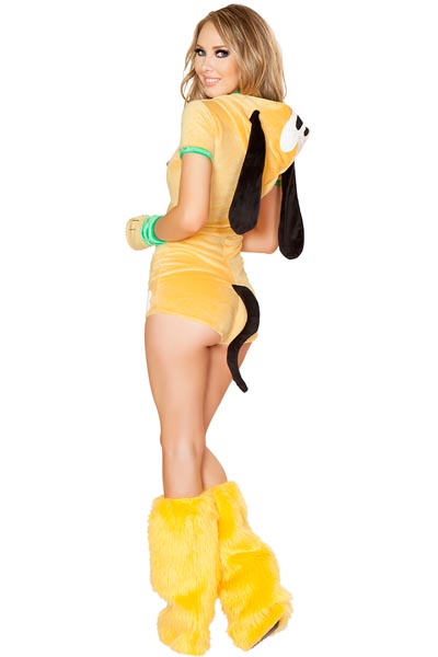 Be everyone's favorite canine companion in this Sexy Cartoon Dog costume featuring a plush yellow romper with a zip up front, bone print detail, short sleeves, attached hood with puppy dog face and ears and attached tail.