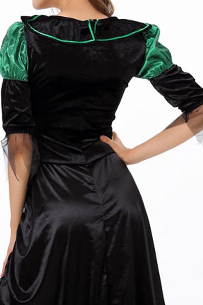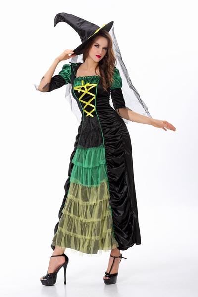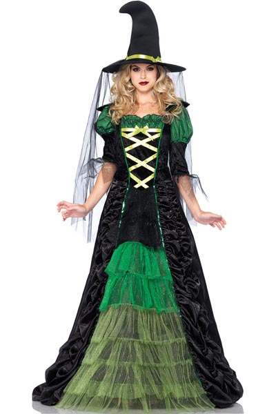 Be enchanting in this Adult Green Witch costume featuring a long black and green ruched dress with tiered glitter tulle front panel, green puff sleeves with tulle trim, faux lace-up ribbon bodice and matching hat with long tulle veil.