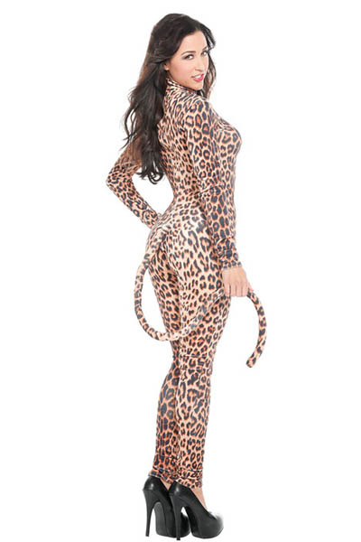 The Leopard Leotard costume includes a leopard print bodysuit with sheer front detail, attached tail .