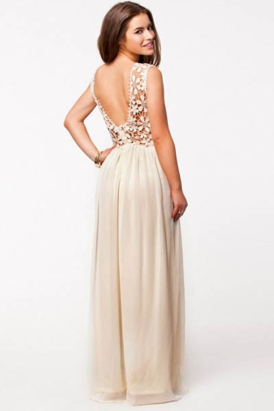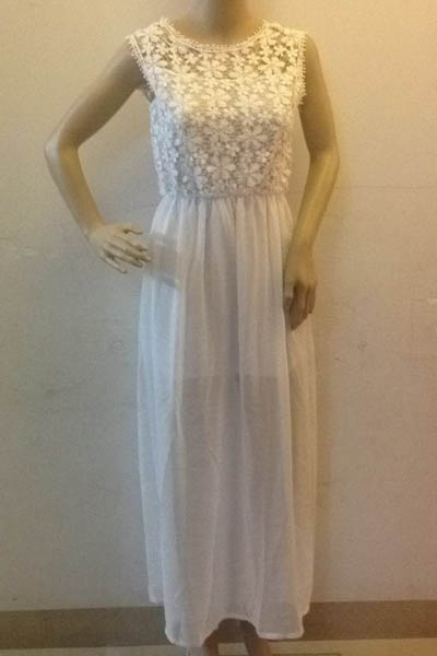 Gender:WomenWaistline:NaturalFabric Type:ChiffonDresses Length:Floor-LengthSilhouette:BeachNeckline:O-NeckColor :whiteSleeve Length:SleevelessDecoration:Hollow OutStyle:BriefMaterial:Polyester,Spandex,Voile