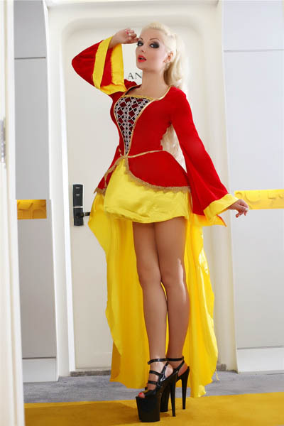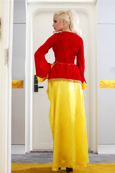 The two-piece, Royally Yours costume includes a red velvet and yellow satin dress