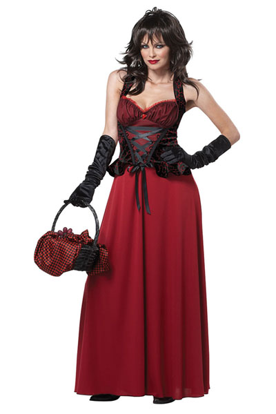 The Dark Red Riding Hood costume is a two piece set that features a long red dress with lace up front and brocade sides. It includes a long red hooded cloak . basket hanky,Basket and gloves not included.
