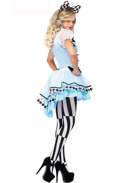 Psychedelic Alice, includes asymmetrical high/low apron dress with layered skirt and lace up waist cincher detail, collar choker, and over-size bow headband.