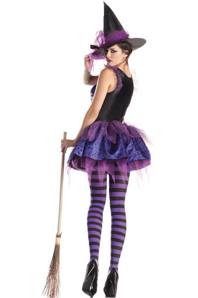 Purple Classic Starry Night Witch Costume L15138 Soar past the moon on your broom when you're wearing this Starry Night Witch Costume. This 100% polyester two-tone purple tank dress has shapes of stars, suns, and moons, and black lace up ribbon and black bows, on the bodice. There are also black shiny accents to help achieve the 'wet-look.' On the skirt of the dress there is glitter tulle and shiny netting for a bouncy look. This costume comes with a black pointed witch's hat with matching glitter tulle trimming on the brim. Purple and black striped tights not come.
