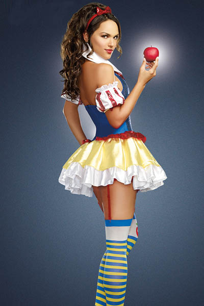 Feisty In The Forest Princess Costume L15142 Don't let the dwarfs boss you around when wearing this two piece Feisty In The Forest costume that includes a fairytale dress with a blue sequin bodice, yellow attached satin skirt, sequin trimmed sleeves, adjustable/removable garters, and headband with sequin bow. (Stockings not included.)