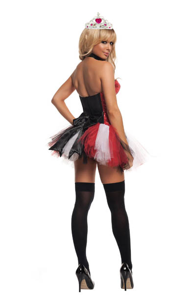 QUEEN OF HEARTS COSTUMEL15151,comes with headwear. Wear this Women's Feisty Queen of Hearts Costume and you can order the beheading of the fool who planted the WRONG color of roses, and then compounded the error by trying to paint them the right color to cover the mistake. Add black thigh-high stockings and sexy shoes to finish off your look.