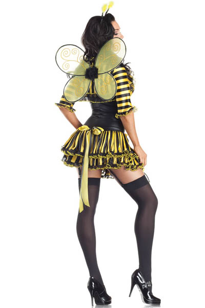 Sassy Bumblebee Costume L15152 Prove your sting can be sweet when in this Sassy Bumblebee costume that includes a yellow and black striped dress with a built in body shaper and ruffle hem skirt, bow accents, garters, matching shrug, antennae and wings. (Stockings not included.)
