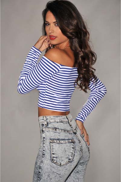 Royal-Blue White Stripes Off-the-shoulder Cropped Top L392-1