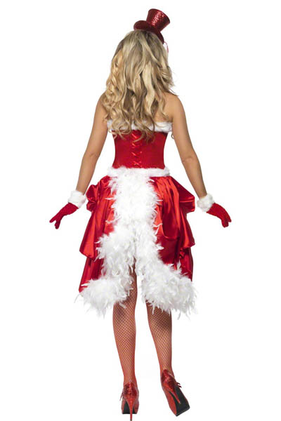 Fever Santa Baby Burlesque Costume L70919 The Fever Santa Baby Burlesque Costume features this red corset with white faux fur trim and metal busk along with a matching draped red skirt with white marabou back feather detail. (Hat and stockings are not included.)