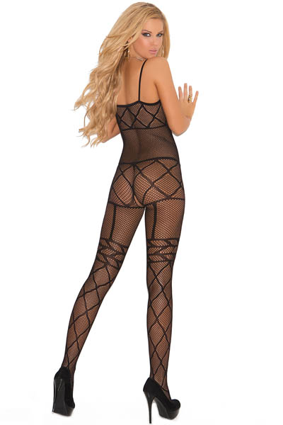 Black fishnet bodystocking with crisscross print detail, spaghetti straps and open crotch.