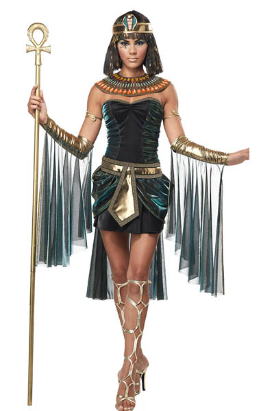 Egyptian Goddess Costume L15192 The Egyptian Goddess costume includes a teal and black, ruched side tube dress with peplum detail, metallic gold belt, long mesh train, metallic gold sleeves with long mesh details, collar and head piece. (Wig, snake arm cuffs, and staff not included.)