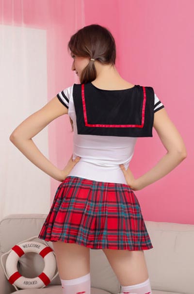 Sweetheart Anime School Girl Costume L15193 Be a doll in this two piece Sweetheart Anime School Girl costume that includes a knit dress with an attached plaid, pleated skirt, cap sleeves with binding detail, a contrasting collar with back shoulder flap, a large center front bow, and G-string.
