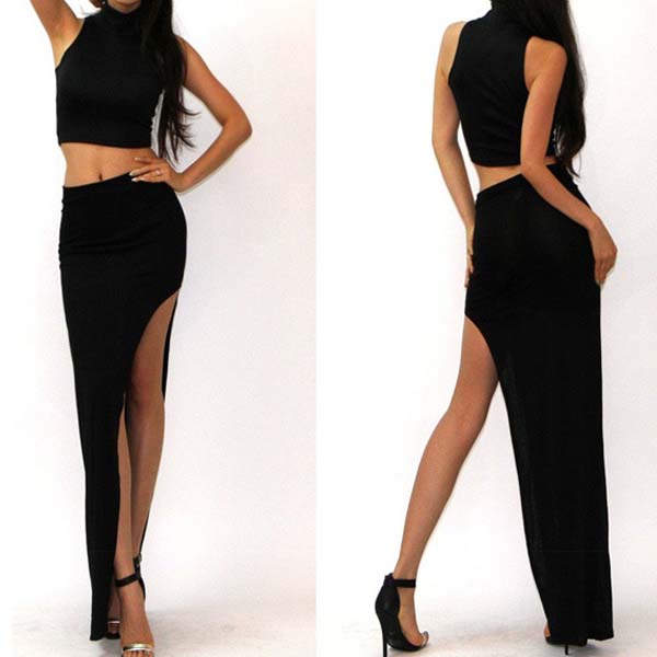 Women Hot Sexy High Waist Side Open Leg Slit Split Long Maxi Skirt Black L396-1