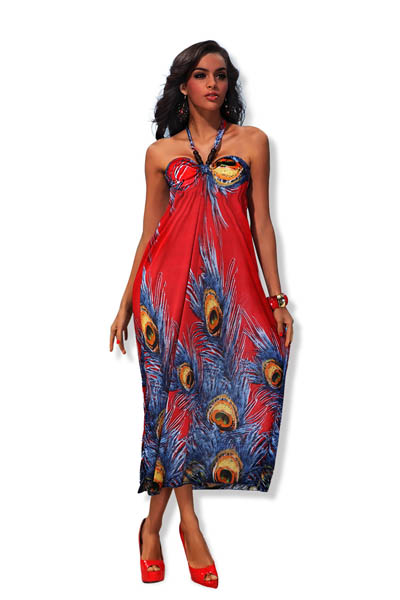 Red Peacock Feather Print Gorgeous Dress L5056-4