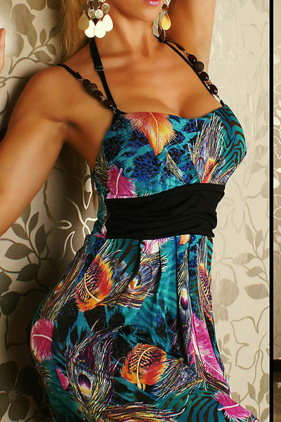 Orange Peacock Feather Print Gorgeous Dress L5056-1