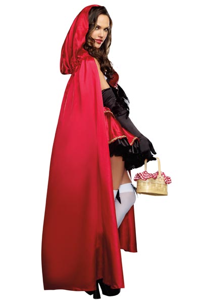 Little Red Costume L15205 Frolic thru the forest to grandma's house in this beautifully detailed two piece Little Red costume that includes a fairytale dress with under wire foam cups, pleated ruffles, embroidered heart trim, lace-trimmed apron, and a full length hooded satin cape. (Basket, stockings, and satin gloves not included.)