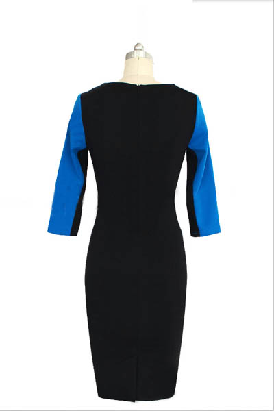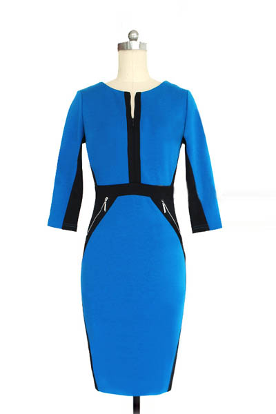 Zipper Fashion Patchwork V Neck Midi Office Dress L36002-1