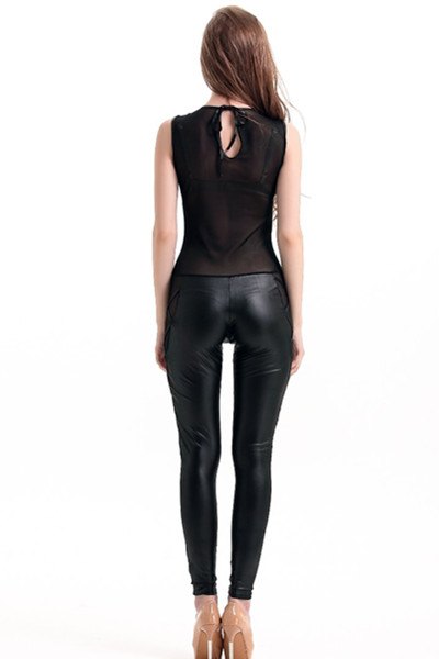 Keep it sleek and sexy in this jumpsuit featuring a mesh back with mesh detailing on the front and sides, criss cross accents, and a curve-hugging fit.