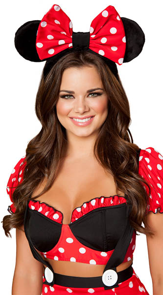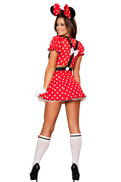 Mousey Mistress Costume L15225 The three-piece, Mousey Mistress costume includes a red and white, polka dot print crop top with black cups, ruffle trim detail, puff sleeves, matching high-waisted skirt with attached suspenders, white bow back, oversized white button details and ear head band with an oversized, red and white polka dot print bow. (Gloves, petticoat, stockings and stocking bows not included.)