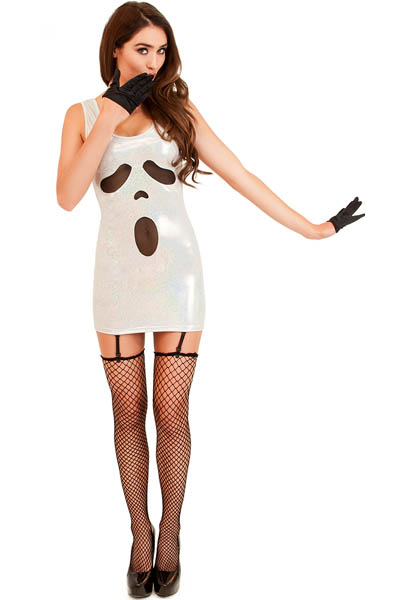 Sexy Scream Costume L15228 Make a scary scene in Lover-baby's limited edition Sexy Scream costume, featuring a curve hugging metallic mini dress with tank straps, a scoop neckline, adjustable garter straps and cut out mesh scream face providing peek-a-boo coverage. (Stockings and gloves not included.)