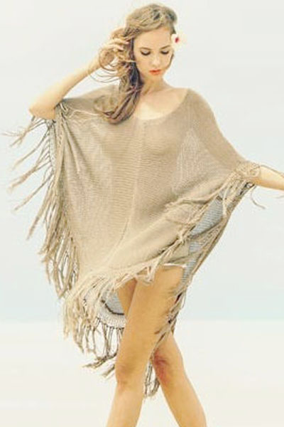 Khaki Knit Fringed Poncho Beachwear L38235-1