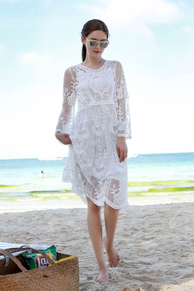White Long Sleeve O-Neck See Through Sexy Lace Embroidered Beach Dress L38242