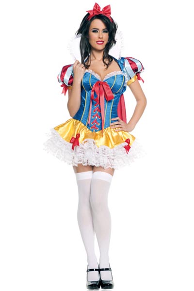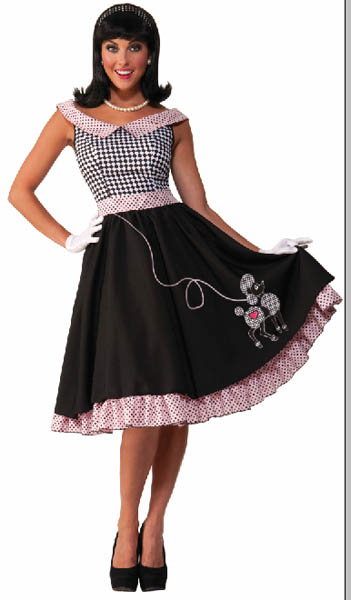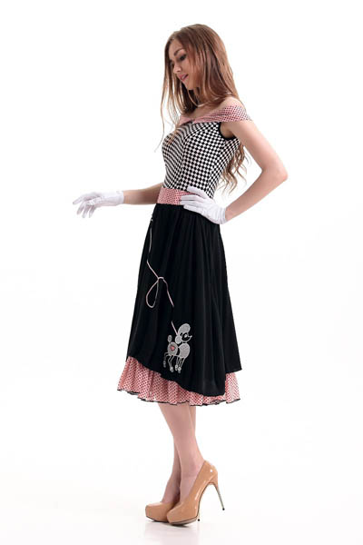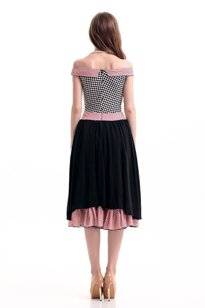 | Checkered bodice and black skirt with pink polka dot off-shoulder collar, waist, and skirt lining peeking from hemline |