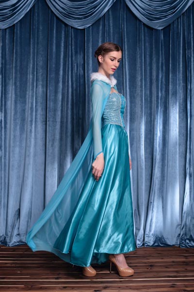 Look cool as ice in this beautiful Snow Princess costume featuring a shimmer organza and sequin dress with glitter cape,
