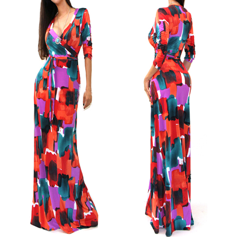 | Fashionable V-Neck Long Sleeve Color Block Maxi Dress L51208-3 |