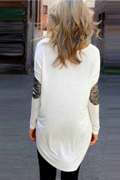 | White High Low Sequins Patched Long Sleeve T-shirt L428-1 |