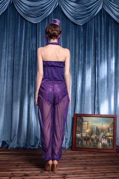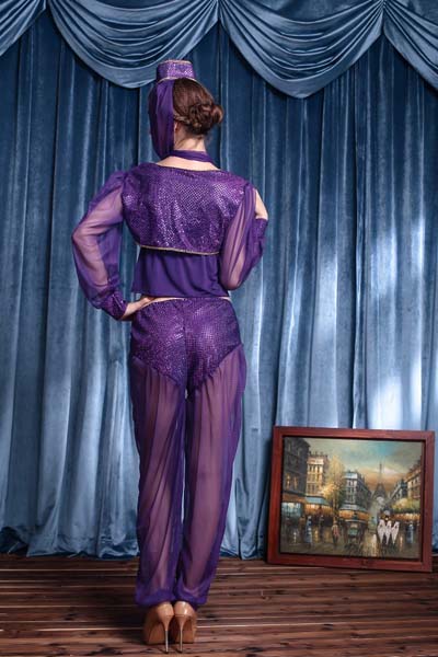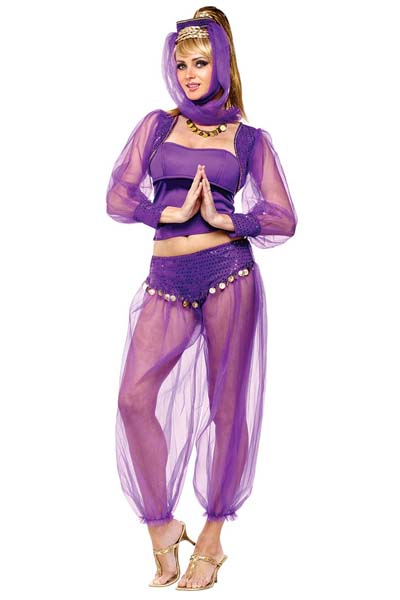 Dreamy Genie Costume L15247 Make every wish come true in this Dreamy Genie costume featuring a fitted purple camisole, bolero jacket, decorative mesh sleeves, matching purple mesh pantaloon pants with gold coin trim, attached purple sequin shorts and a matching hat with an attached veil. (Shoes and necklace not included.)