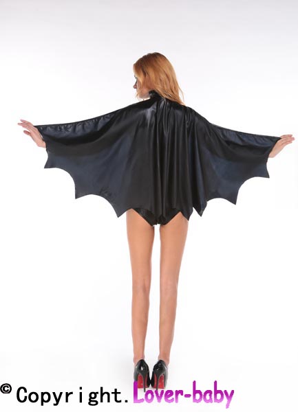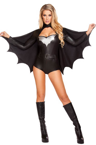 Sexy Night Vigilante Costume L15254 Bask in the moonlight in this three-piece Sexy Night Vigilante costume featuring a black faux leather romper with a silver bat print bust, long sleeves, detachable black bat cape, black faux leather belt, a high neck with a large keyhole opening and a zip-up back closure.