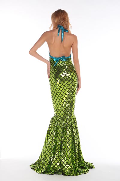 Just keep swimming in this Sirena the Mermaid costume featuring a blue shell crop top with halter and back ties, and a high waisted green mermaid trumpet skirt with scale accents. (Jewelry not included.)