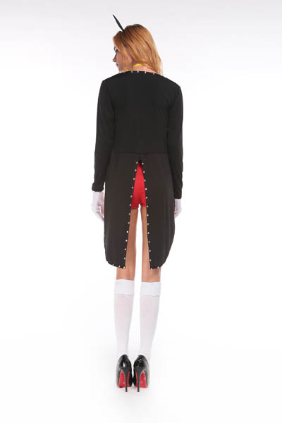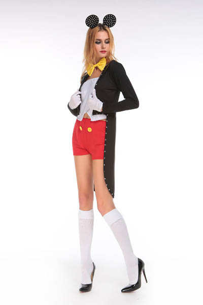 Mousy Maiden Costume L15262 Be the leader of all of your friends in this fun Mousy Maiden costume featuring a black long sleeve cropped jacket with rhinestone trim, tuxedo tails, a strapless white top, red high waisted shorts with yellow buttons, a rhinestone mouse ear headband and an oversized yellow bowtie. (Gloves and knee high stockings not included.)