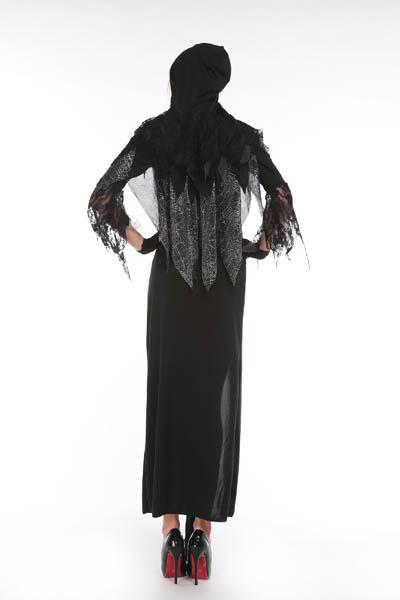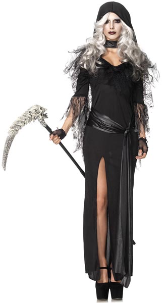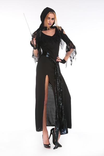 Lead the dead with this two-piece Sexy Soul Stealer costume featuring a black high slit hooded dress with a wet look waist sash, lace trimmed sleeves and neck choker. (Scythe and wig not included.)