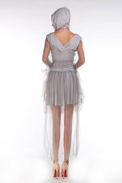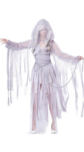 Frighten the living in this Haunting Beauty costume featuring a gray tattered dress, gray tattered shrug with attached hood, and silver chains.